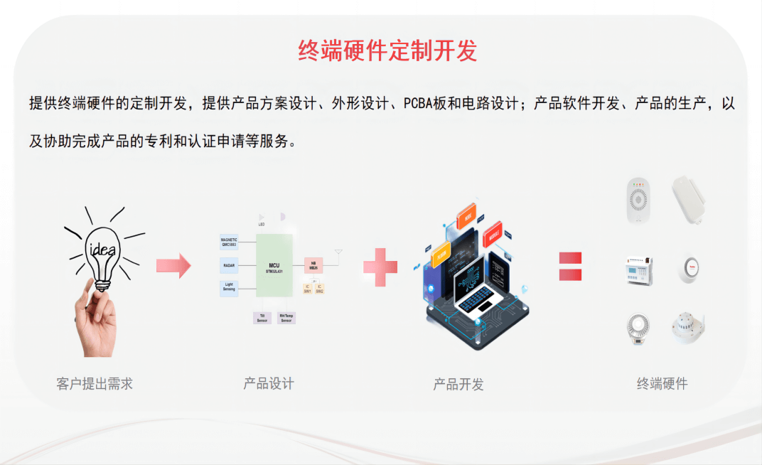 无限娱乐科技提供应用广泛的低成本、低功耗的物联网模块、终端、通用物联网云平台、行业应用平台以及手机/微信应用等定制开发服务,解决没有任何开发技术基础的企业制造难的问题。我们为您提供项目全生命周期的技术指导,从方案评估到样机开发,小批量试产直至批量量产。 √  支持硬件电路、模块、终端、网关定制开发 √  支持物联网平台、应用软件定制开发 √  支持联网产品认证服务 √  支持现有产品OEM